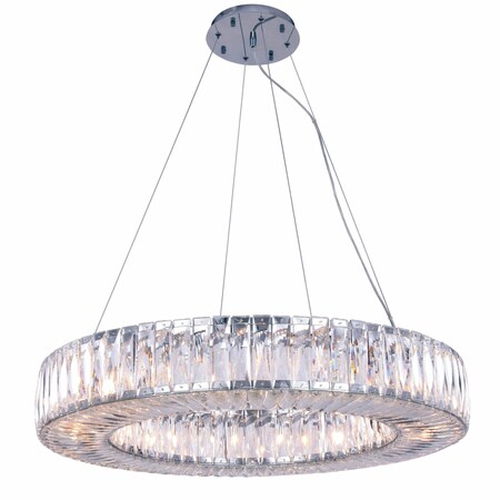 Bring the bling to your home with Cuvette collection hanging fixtures. A multitude of clear faceted crystals form a perfect glittering ring in a gleaming chrome-finished frame. Nine to 24 capsule-shaped bulbs (not included) glow from within the geometric crystals lining the ring inside and out for full-dimensional brilliance. Dazzling Cuvette chandeliers will be the jewel of your dining room, bedroom, or bathroom.