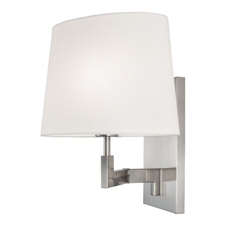 8240-BN-WS Grace Finishes Burshed Nickel (BN) Shade White Shade Description An elegant sconce with oversized back plate and a hinged arm joint is softened by a delicate white fabric oval shade.