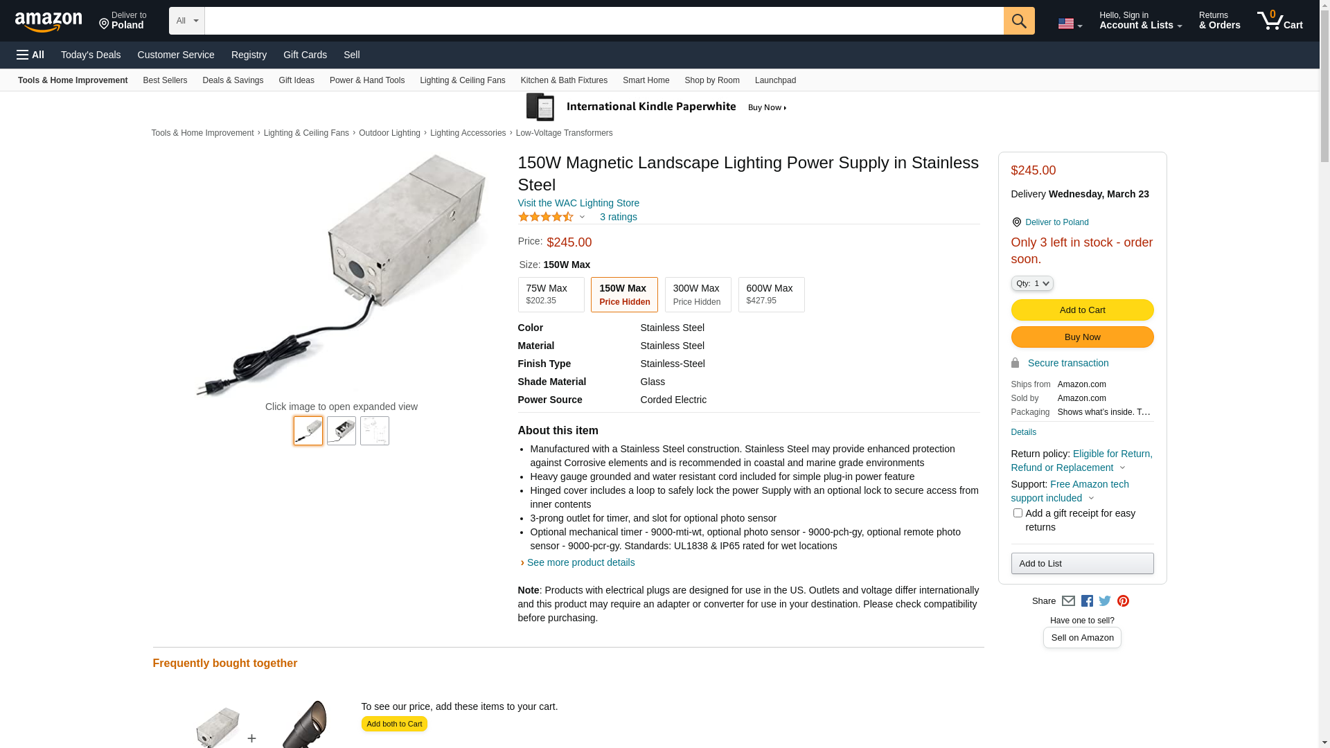 - Power supplies are manufactured in 75W (SKU # 9075-TRN-SS), 150W (SKU # 9150-TRN-SS), 300W (SKU # 9300-TRN-SS), and 600W (SKU # 9600-TRN-SS) sizes, we recommend a size that is 75% of your total power needs to allow room for adding fixtures to your system down the road.