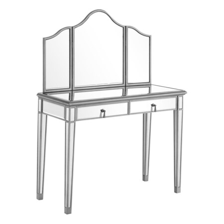 Vanity Table 42 in. x 18 in. x 31 in. and Mirror 39 in. x 1 in. x 42 in.The Chamberlan collection is a modern and sleek decor family. Every versatile item in this collection will add a soft contemporary feeling to any place in your home.