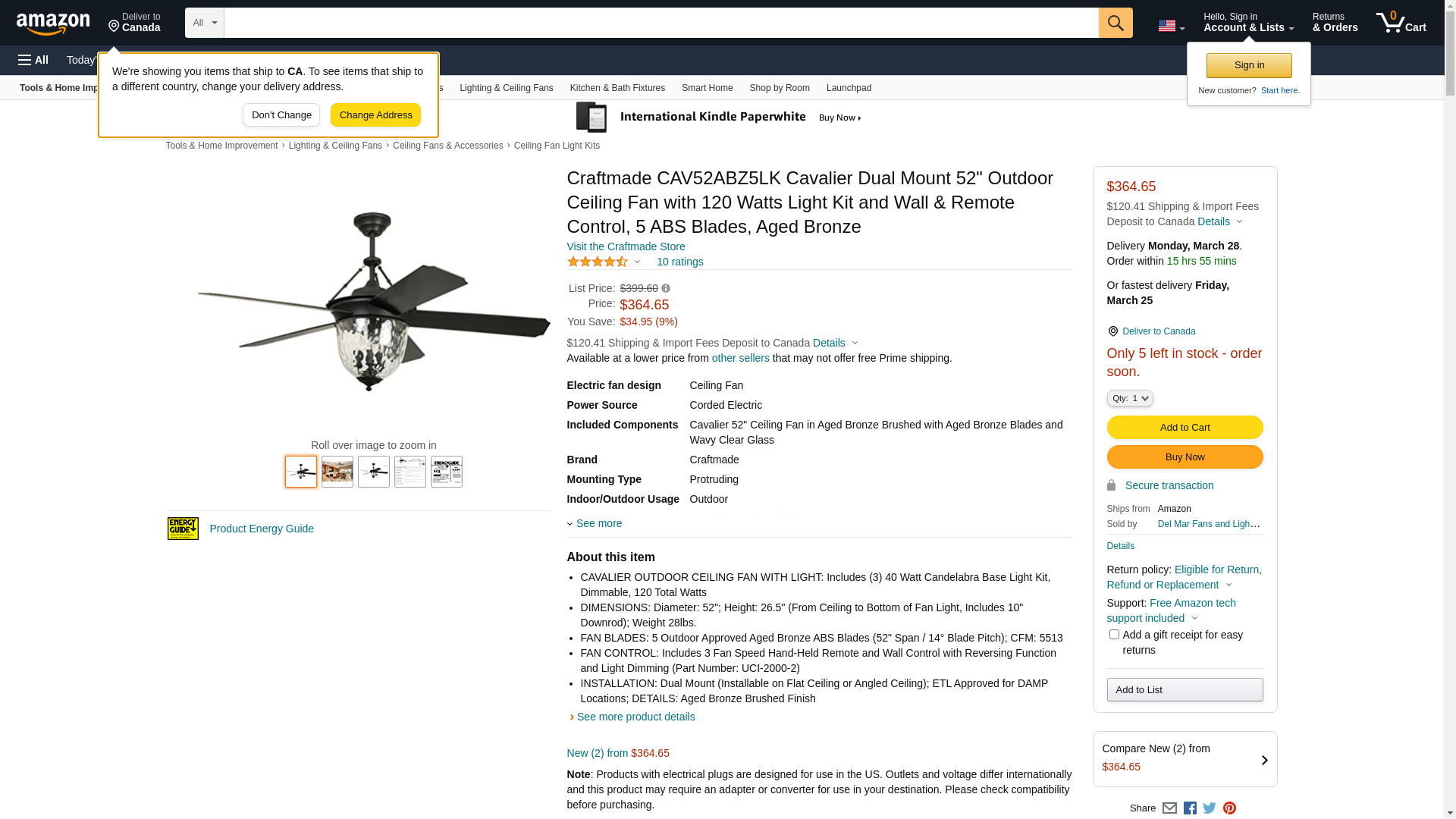 ![]() gordonelectricsupply.com | CAV52ABZ5LK | 1 | Craftmade Orders usually Ship Next Day | 1 | 1 @ $429.00 |