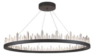 The Malta collection is an amazing blend of Old World functionality and 21st-century technology. Its classic shape a big ring hanging from the ceiling is the same basic principle that brightened castles by candlelight for thousands of years; but now the ring is satin-dark-grey metal, and the illumination comes from special crystals that connect to an LED strip around the perimeter of the fixture. The strip has embedded chips on it and the crystals are magnetized, so you simply set them into place on the metal and the crystals light up instantly.