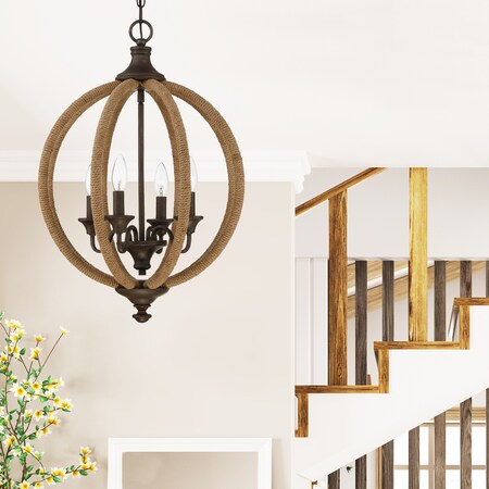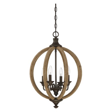 The highly textured rustic look of the Savoy House Findlay 4-light pendant comes from the rope-wrapped open orb structure encircling the light sources and the fashionable Artisan Rust finish.