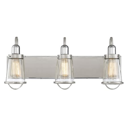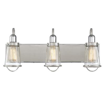 The Savoy House Lansing bathroom vanity light’s industrial-inspired design brings a solid, practical, and vintage aesthetic to your home. Sharing its name with the Michigan city that was once an automotive industry hub, the Lansing bathroom vanity light is fittingly industrial with a sturdy rectangular wall plate and cage-like details on the shade. Curved light arms soften the look while satin nickel finished hardware, polished nickel accents and clear tapered glass shades present the tailored, clean and crisp look you want in a bathroom light. The classic style is an excellent fit with industrial chic, modern farmhouse, urban loft, transitional, and eclectic decor.