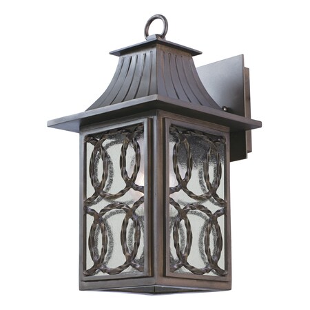 Roped Circular Accents with Clear Hammered Glass, Heavy Gauge Aluminum Construction in an Aged Brass finish.<br/><br/>Features :<br/><br/>- Materials: Aluminum, glass<br/>- Finish: Aged bronze<br/>- Dimmable: Yes<br/>- Dimmer type: Refer to bulb manufacturer for compatibility<br/>- Sockets: 1<br/>- Lamp type: E26 Medium<br/>- Bulbs include: No<br/>- Listing: cETL<br/>- Rating: Wet.<br/><br/>Specifications :<br/><br/>- Product Dimensions : 14.5"H x 8"W<br/>- Product Weight : 8 lbs<br/>- Product Dimensions : (Backplate) 5.25"W x 5.75"D x 1"H<br/>- Product Dimensions : (Max ext) 9"<br/>- Product Dimensions : (Mounting height) 5"<br/>- Product Dimensions : (Wire length) 12"<br/>- Number of Lights : 1<br/>- Wattage : 60W<br/>- Voltage : 120V.