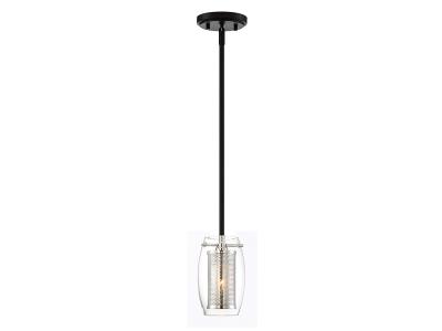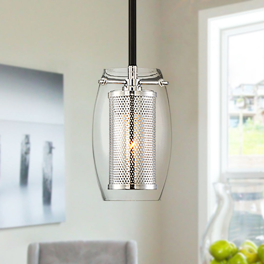 From the imaginative mind of designer Brian Thomas comes a mini light pendant with very big impact. Ultra chic and current with its use of mixed metals, the fashionable Dunbar 1-light mini-pendant by Savoy House is the ideal interior lighting choice for transitional, contemporary, mid-century modern, and industrial decors. With its polished chrome mesh and clear glass styling suspended by a sleek, two-tone matte black metal rod, it looks great as bath lighting, entry lighting, over a stairway or in the kitchen. Made with premium quality components, it has an adjustable rod length and canopy that adapts to sloped ceilings. Hang one for a minimalist look, or hang a grouping of these mini light pendants at varying heights for added impact.