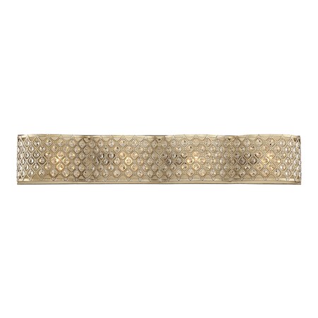 Glamour galore! The Regis has an upscale aesthetic, with luxury finishes and fine detailing, to illuminate and elevate your bath. This bath bar measures 32 wide, 5.5 high, and extends 4.5 from the wall -truly the perfect size to add elegant style above the vanity in your bathroom or powder room. The Regis has a grand appearance courtesy of the gleaming, metallic, Pyrite finish, and the gorgeous latticework of multi-faceted clear crystals. The lattice shade sweeps across the width of the fixture, in graceful curves. Behind the crystal laden shade, attached to the wall plate, there are four 60W, C-style bulbs for beautiful, flattering light. Overall, a sumptuous fixture for everyday luxury. Bathroom/Bed Room/Dining Room/Living Room/Family Room/Great Room/Kitchen/Foyer/Entryway/Stairway/Hallway/Office/Billiard Room/Media Room / Mounting Direction: Reversible / Assembly Required: Yes / Dimable: Yes.