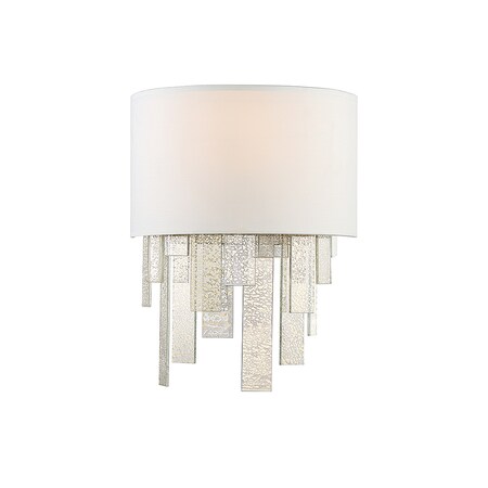 Get a stunning, textured shimmer and shine with the Fairmont 1-light sconce from Savoy House. Its crisp white fabric shade holds layered rows of mercury glass strips that catch the light in beautiful ways. Polished nickel finish.