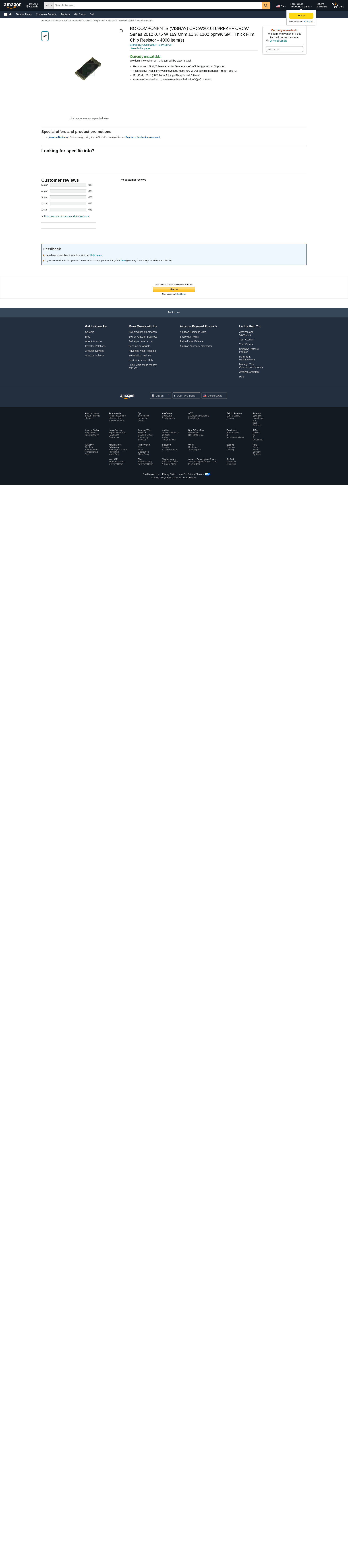 BC COMPONENTS (VISHAY) CRCW2010169RFKEF CRCW Series 2010 0.75 W 169 Ohm ±1 % ±100 ppm/K SMT Thick Film Chip Resistor - 4000 item(s)