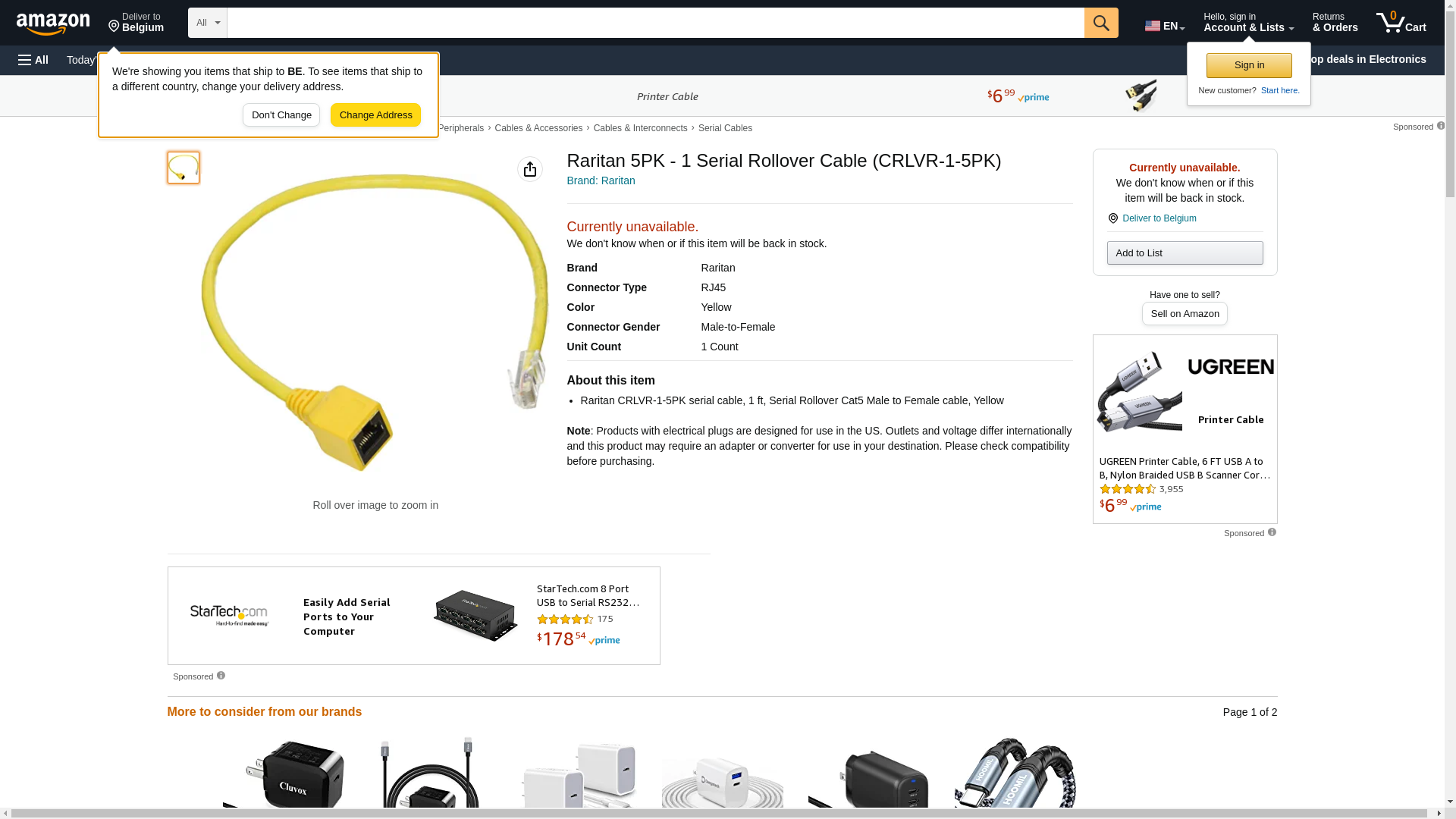 - Raritan CRLVR-1-5PK serial cable, 1 ft, Serial Rollover Cat5 Male to Female cable, Yellow