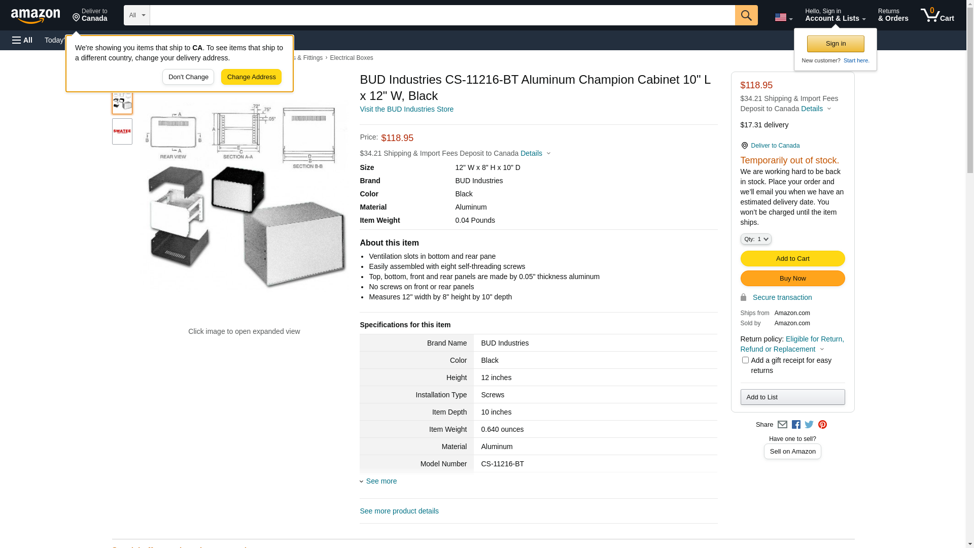 Bud Industries Enclosure, Cabinet, Aluminium, Black - CS-11216-BT