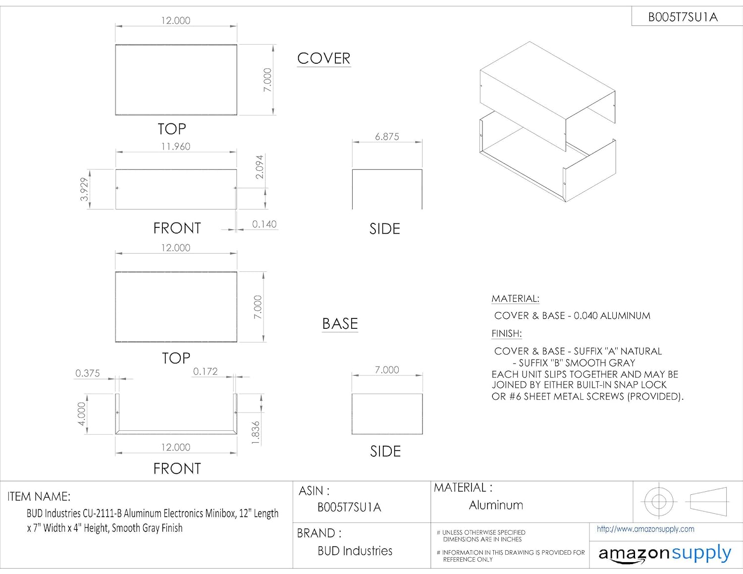 BUD Industries CU-2111-B Aluminum Electronics Minibox 12" L x 7" W x 4" H, Gray