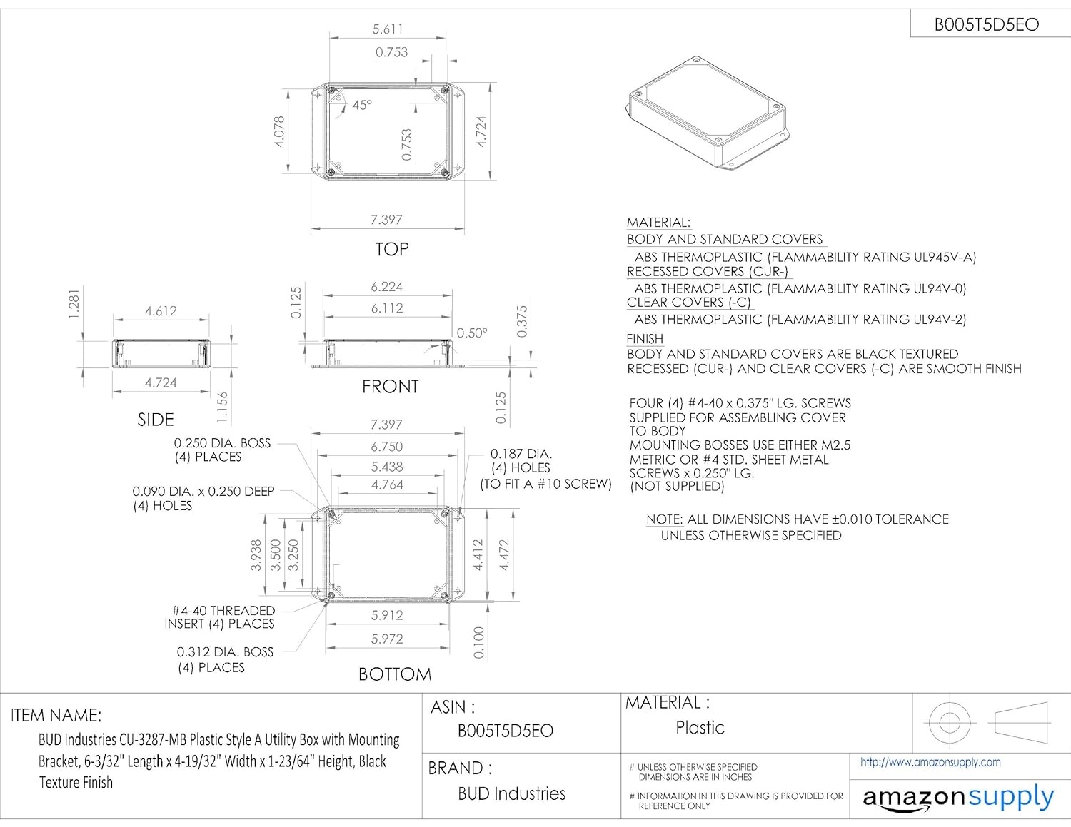 BUD Industries CU-3287-MB Plastic Style A Utility Box 6.11" L x 4.61" W x 1.4" H, Black