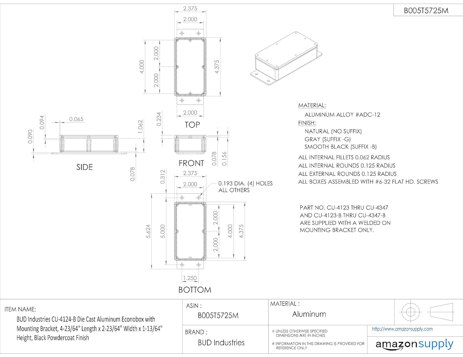 BUD Industries CU-4124-B Die Cast Aluminum Econobox 4.38" L x 2.38" W x 1.22" H, Black