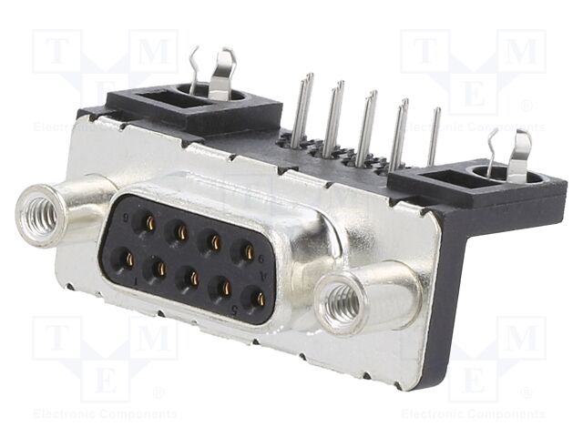 Orientation: Right Angle<br>Number of Contacts: 9<br>Termination Method: Solder Tail<br>Shell Plating: Bright Pure Tin over Nickel<br>Amperage Rating: 5A Per contact<br>Operating Voltage DC: 300V rms at 50 Hz<br>Operating Voltage AC: 300V rms at 50 Hz<br>Contact Mating life: Std Class (>200)<br>RoHS: Yes