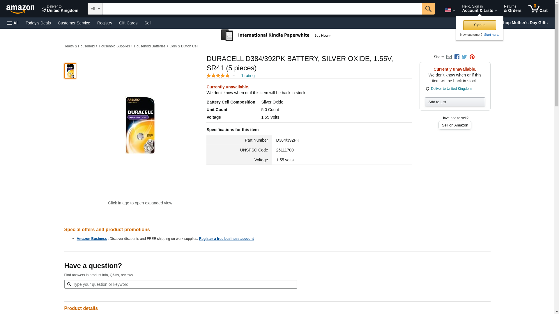 Duracell Battery, Silver Oxide, 1.55V, Sr41 - D384/392PK