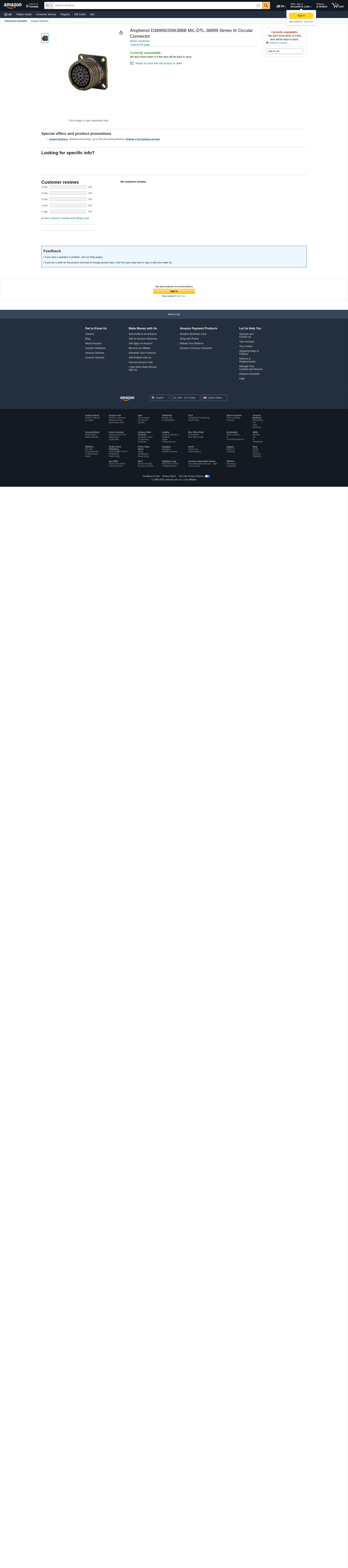 | Digi-Key | AD38999/20WJ8BB-ND | 1 | 1 | 1 @ $203.64, 5 @ $180.24, 10 @ $172.23, 25 @ $158.67 |