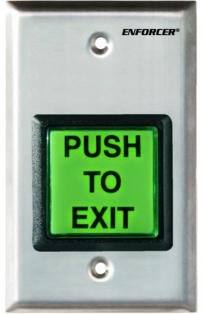 <p><b>Seco-Larm SD-7202GC-PEQ ENFORCER LED Illuminated RTE Single-gang Wall Plate with Large Green Button, Large Illuminated Push Button with Caption "PUSH TO EXIT", Pushbutton Rated 10A at 125 to 250VAC</b></p> <b>Key Features</b><ul> <li>Large illuminated push button with caption "PUSH TO EXIT"</li> <li>Message language can be easily switched between English, Spanish, and French with 3 included interchangeable plates</li> <li>Pushbutton rated 10A at 125 to 250VAC</li> <li>Includes five colored 12-inch wire leads with easy-to-attach spade lugs for fast installation</li> <li>LED Gives over 50,000 hours of illumination</li> <li>12 to 24 VDC: No resistors required</li> <li>Includes stainless-steel single-gang plate</li></ul> <b>Specifications</b><ul> <li>Operating Voltage: 12 to 24VDC</li> <li>Current Draw: 10A at 250VAC</li> <li>Operating Temperature: -40° to 167°F (-40° to 75°C)</li> <li>Material: Brushed stainless</li> <li>Dimensions: 4-1/2" x 2-3/4" x 2-3/4" (114 x 70 x 70 mm)</li> <li>Weight: 3.7-oz (105g)</li></ul>