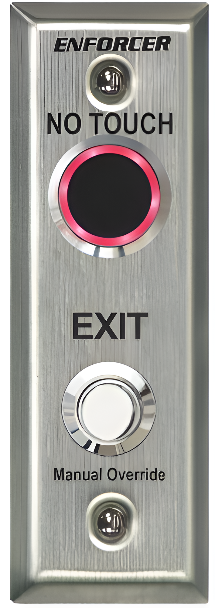 Seco-Larm SD-9163-KSVQ ENFORCER Slimline Outdoor Wave-to-Open Sensor with Manual Override and English, Adjustable Sensor Range Up to 7" (18cm), Stainless Steel Plate, Weatherproof (IP65)<br><br> The ENFORCER Outdoor Wave-to-Open Sensor is a full-featured exit plate which uses IR technology to allow egress from a protected area or activate a device with the simple wave of a hand. Since no touch is required, this sensor is suitable for use in hospitals, clinics, labs, schools, factories, or offices.<br><br> Key Features<br> - Adjustable sensor range up to 7" (18cm)<br> - Stainless steel plate<br> - Weatherproof (IP65) for outdoor use<br> - Clean and simple no-touch operation<br> - 1.2A relay, adjustable trigger duration 0.8~30 seconds or toggle<br> - LED illuminated sensor area for easy identification<br> - Selectable LED colors (turns from red to green or green to red) to show sensor activated<br> - Manual override button functions without electricity in case of power failure<br> - ETL, Conforms to UL Std. 294<br><br> Specifications<br> - Operating temperature: 12~24 VDC<br> - Current draw (max. ±10%): Standby red (12/24 VDC): 13mA / 15mA; Triggered green (12/24 VDC): 21mA / 25mA; Standby green (12/24 VDC): 12mA / 14mA; Triggered red (12/24 VDC): 23mA / 28mA<br> - Relay type: SPDT dry contact, 1.2A@24VDC<br> - Response time: 10ms<br> - LED: Standby: Red / Triggered: Green<br> - Ouput duration: 0.8~30 s, toggle<br> - Range: 2"~7" (5~18 cm)<br> - Destructive attack: Level I<br> - Line security: Level I<br> - Endurance: Level IV<br> - Standby power: Level I<br> - IP Rating: Weatherproof, IP65<br> - Operating Temperature: -4°~131°F (-20°~55°C)<br> - Dimensions: 1-1/2" x 4-1/2" (39 x 115mm)<br> - Weight: 2.7-oz (77g)<br><br>