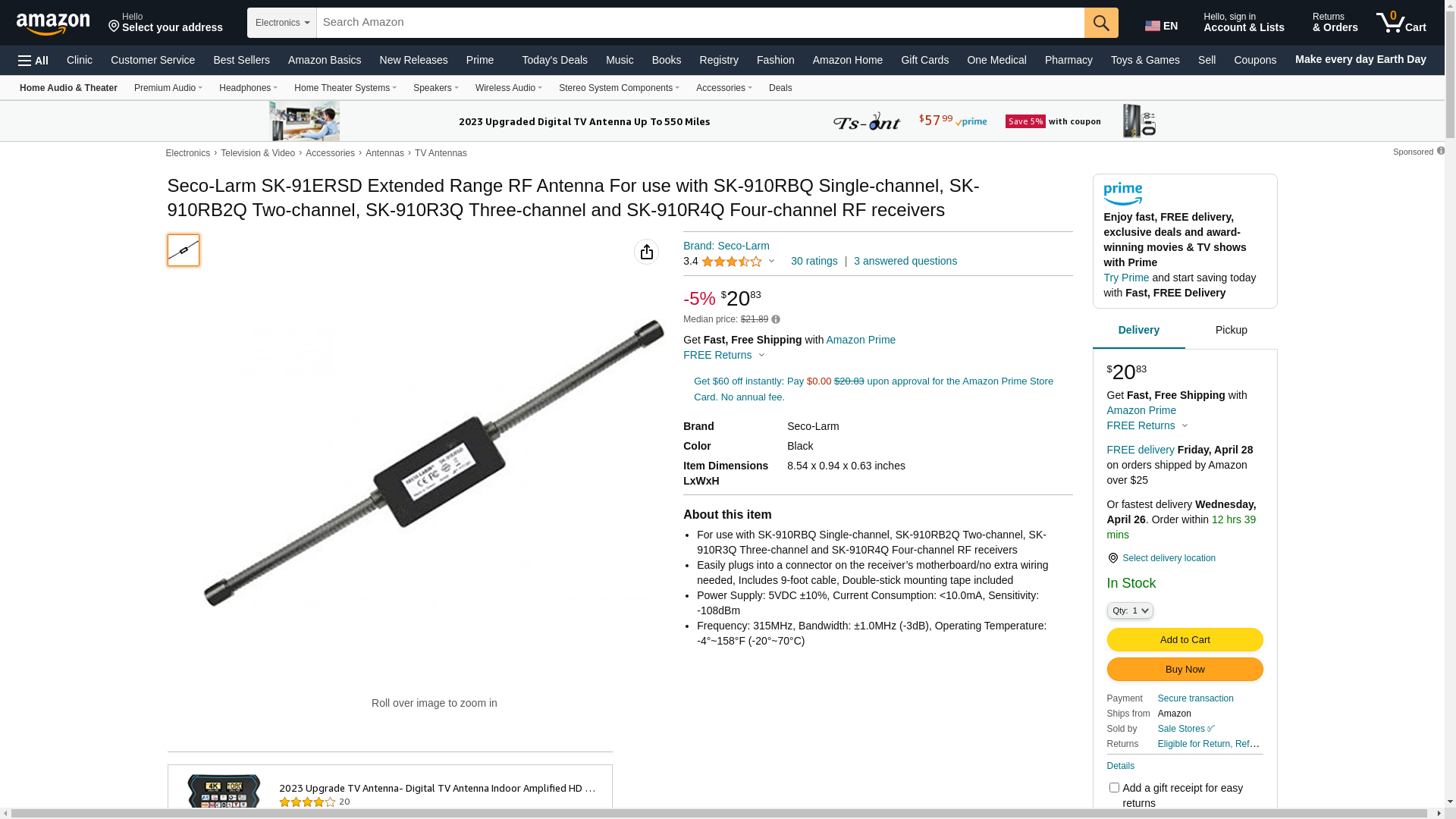 Seco-Larm SK-91ERSD Extended Range RF Antenna For use with SK-910RBQ Single-channel, SK-910RB2Q Two-channel, SK-910R3Q Three-channel and SK-910R4Q Four-channel RF receivers