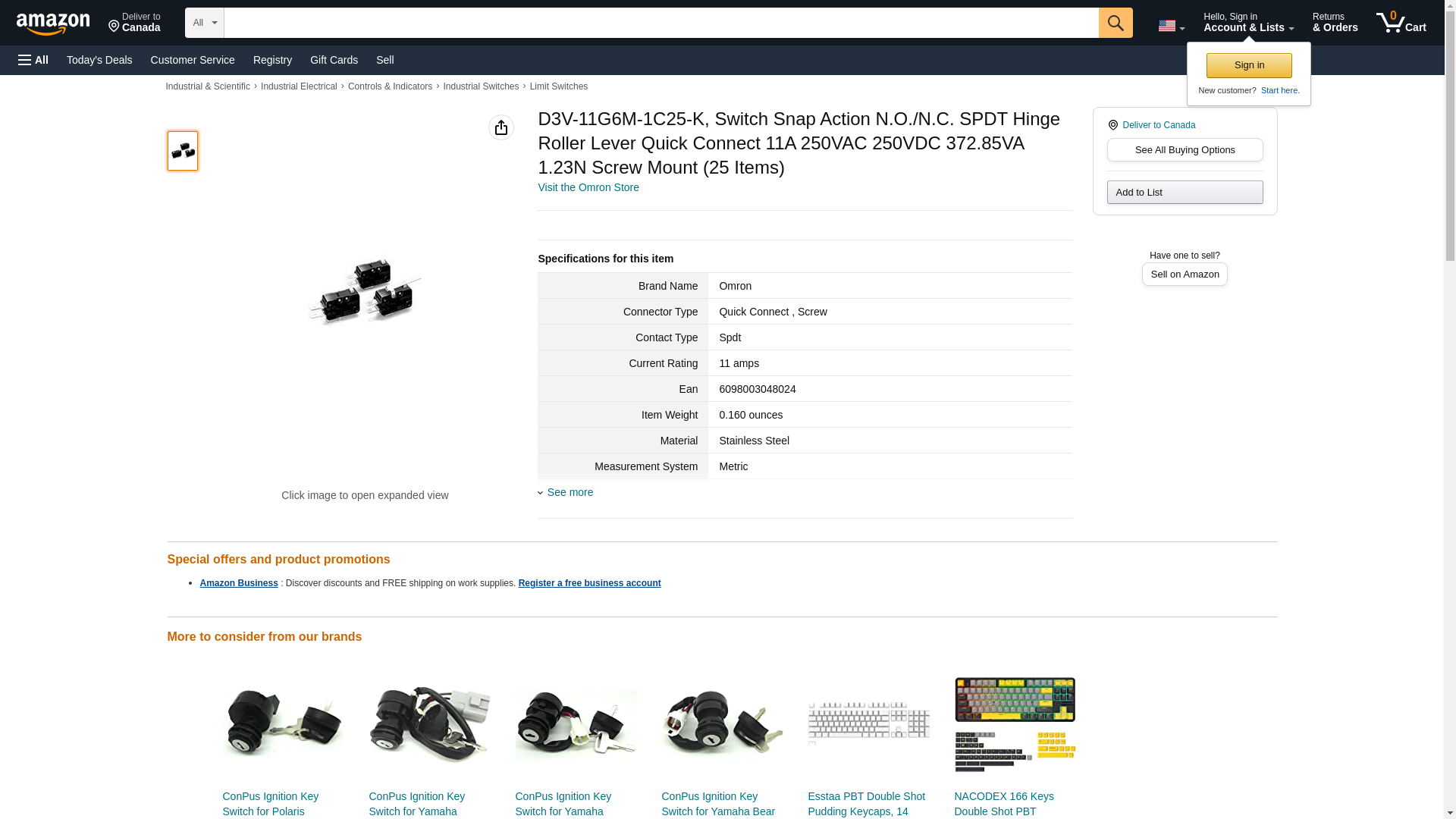 D3V-11G6M-1C25-K, Switch Snap Action N.O./N.C. SPDT Hinge Roller Lever Quick Connect 11A 250VAC 250VDC 372.85VA 1.23N Screw Mount (25 Items)