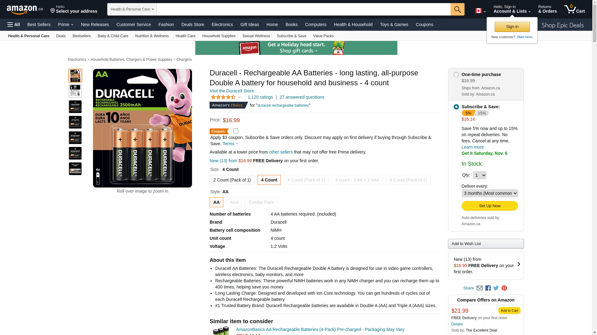 | Feature | Duracell AA NiMH rechargeable blister pack, 4 per pkg. |