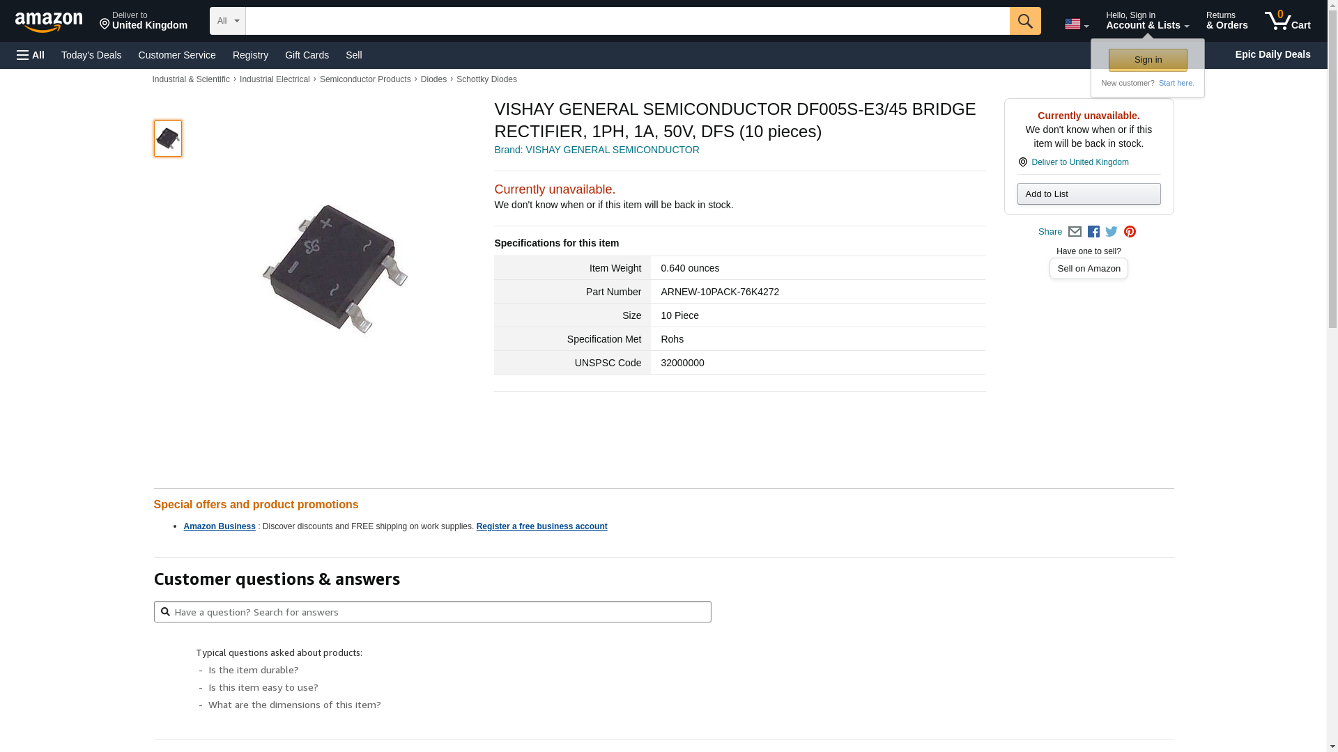 ![]() TME | DF005S-E3/45 | 3 | 3 | 3 @ $0.35, 25 @ $0.32, 100 @ $0.28, 500 @ $0.25, 5000 @ $0.24 | |