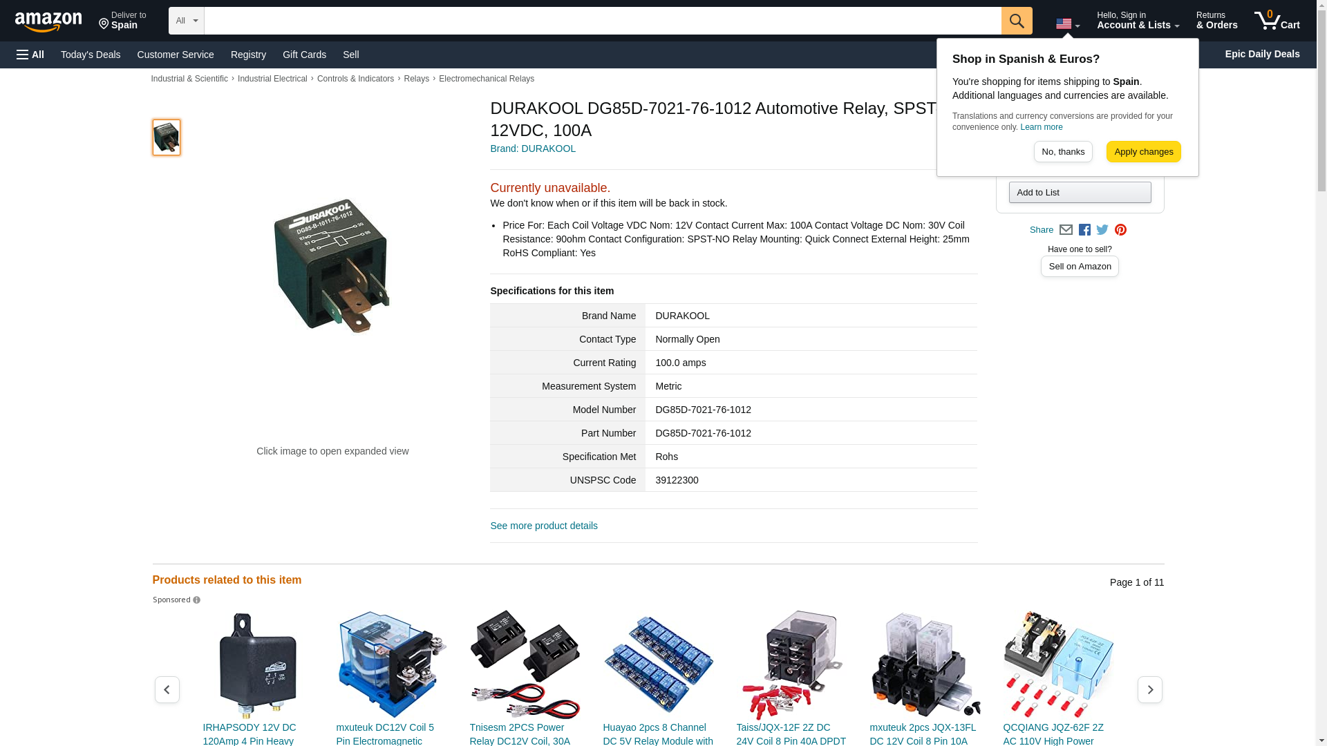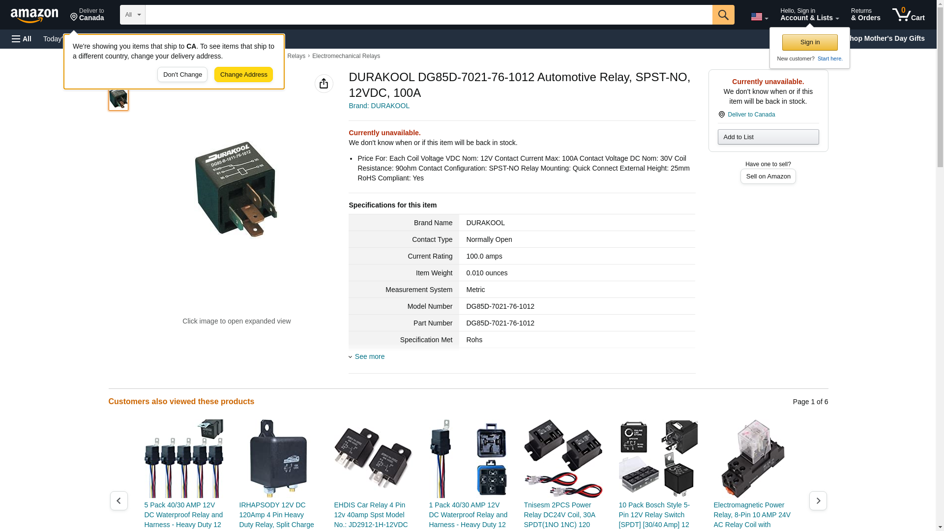 DURAKOOL DG85D-7021-76-1012 Automotive Relay, SPST-NO, 12VDC, 100A