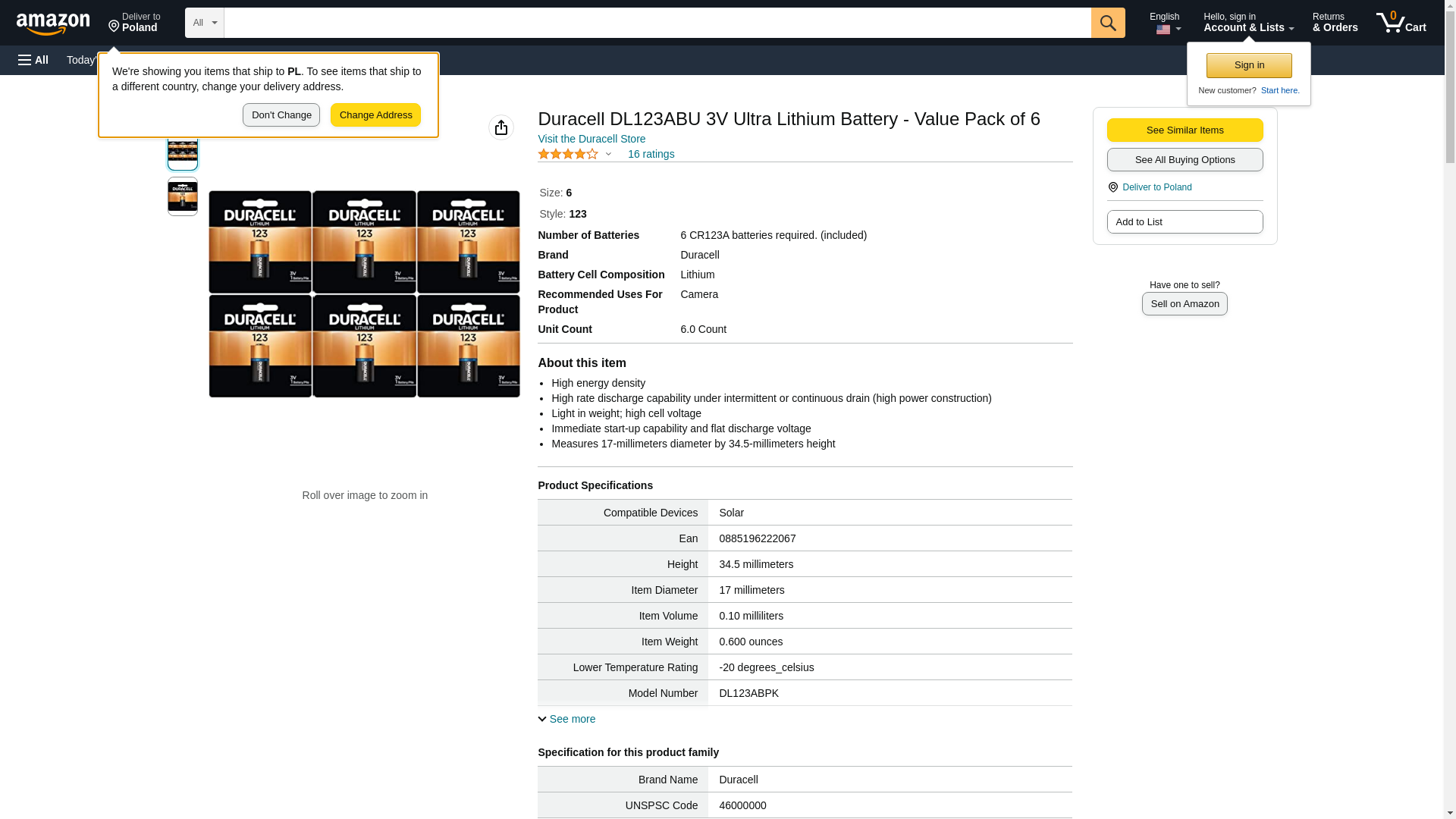 Duracell DL123ABU 3 Volt High Power Ultra Lithium Battery (Value Pack of 6) Features: Very high energy density and excellent rate capability. Up to 4 times the power of alkaline batteries. Excellent shelf life. Batt. Type: Lithium. Used With: Photo. Size: 3 Volt. Product Type: Alkaline/Lithium. Generic Specifications: Voltage: 3.00 V. Dimensions: Overall Height Top to Bottom: 1.36". Overall Width -Side to Side: 17.018 Millimeters. Diameter: 17.018 Millimeters. Overall Product Weight: 0.05 lbs.