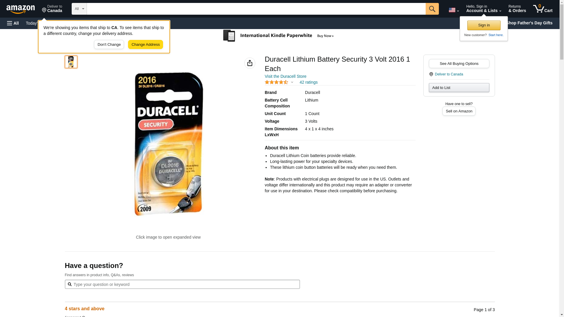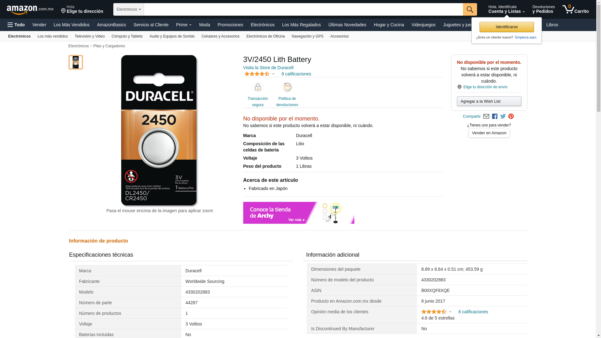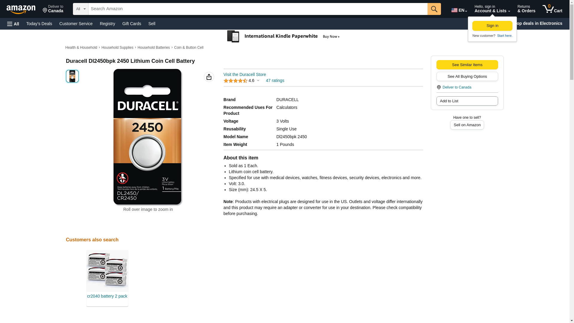 Sold as 4 UNITS at $5.55 per unit. (1 unit = each.) Watch and calculator battery. Lithium. 3.0 volts. Carded. Manufacturer number: DL2450BPK. SKU #: 3037769. Country of origin: (TBA). Distributed by Duracell Div. of P & G.