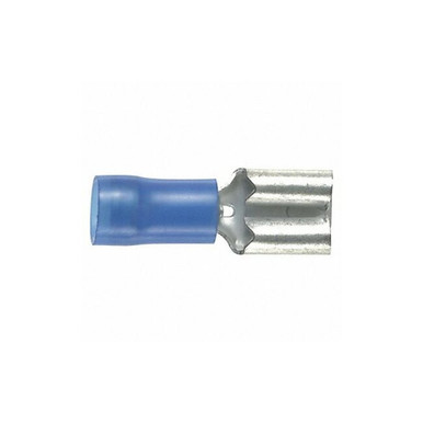 Disconnect can be inserted and removed from the male tab without the use of tools for lower installed cost. Metal insulation grip sleeve crimps to wire insulation, providing protection to the crimp joint during high vibration applications.<br /><br /> Item: Female Disconnect<br /> Insulation: Partial<br /> Insulation Type: Nylon<br /> Insulation Color: Blue<br /> Wire Range: 16 to 14 AWG<br /> Tab Size: 0.032" x 0.250"<br /> Barrel Inside Dia.: 0.101"<br /> Max. Temp.: 194 Degrees F<br /> Max. Voltage: 300V<br /> Overall Length: 0.830"<br /> Seam: Sleeved Barrel<br /> Connection Material: Tin-Plated Brass<br /> Standards: UL 310, CSA22.2 No. 153, American Bureau of Shipping (ABS), RoHS Compliant<br /> Connection Type: Crimp