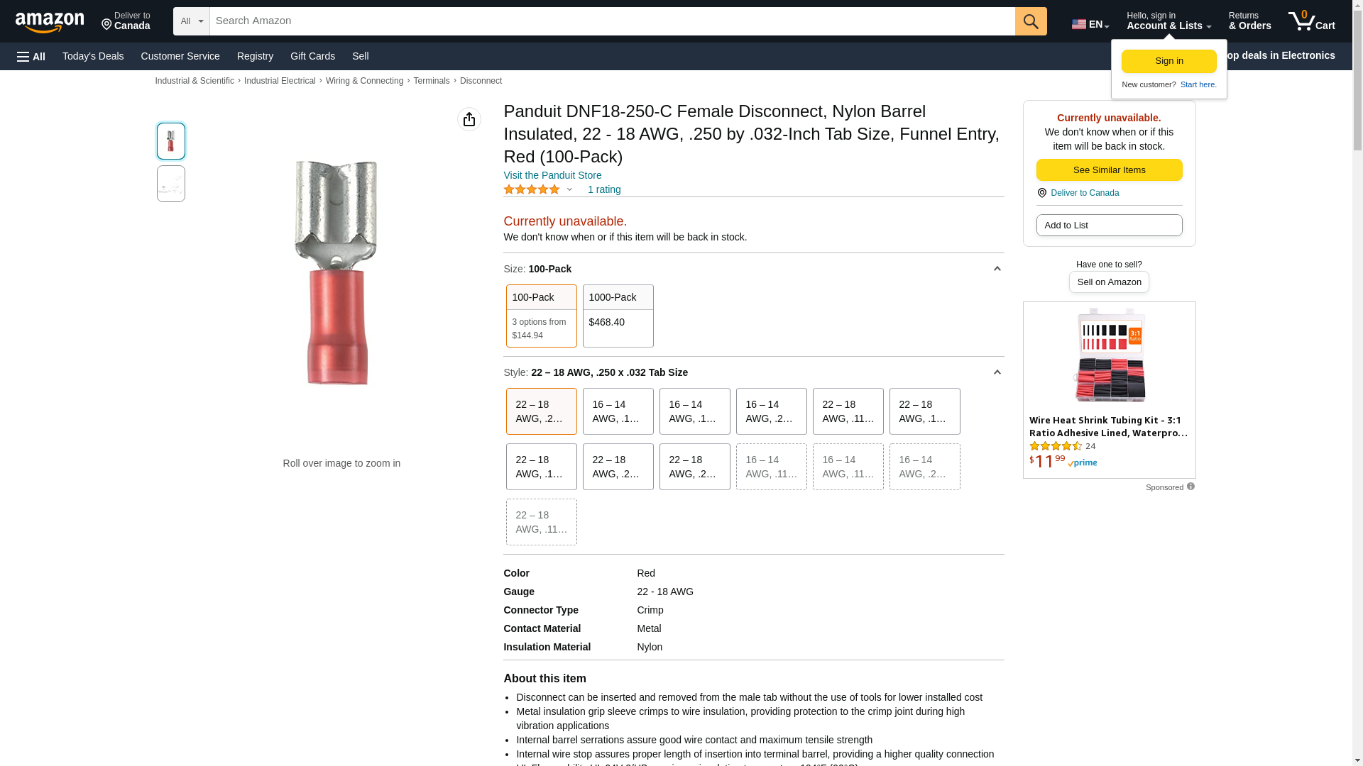 Panduit DNF18-250-C Female Disconnect, Nylon Barrel Insulated, 22 - 18 AWG, .250 by .032-Inch Tab Size, Funnel Entry, Red (100-Pack)