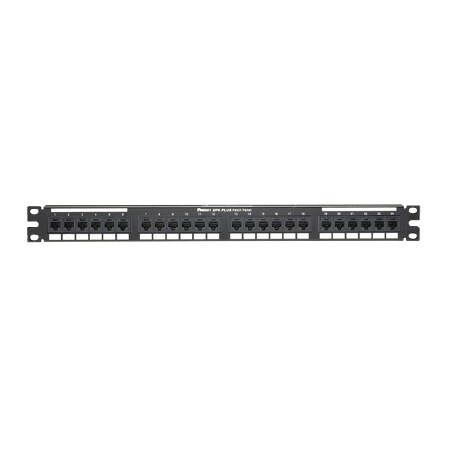Provide protection, management, and organization to data centers and telecommunication rooms with this patch panel. It mounts to 19" and 23" racks, and is easy to identify with preprinted numbers, write-on areas, and optional label kits.<br /><br /> Item: Patch Panel<br /> Category Type: 6<br /> Panel Style: Flat<br /> Panel Type: 110<br /> Number of Ports: 24<br /> Material: CRS<br /> Mounting Style: Rack Mount<br /> T568 Standard: A/B<br /> Rack Units: 1<br /> Connectors per Panel: 24