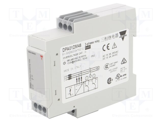 CARLO GAVAZZI DPA01DM48 3 Phase, Phase Monitoring, DIN Rail Mount, DPDT, 10VA Power Consumption, Relay, 380-480VAC