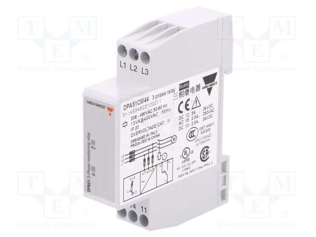 Carlo GAVAZZI - DPA51CM44 - Phase Monitoring Relay, Sequence, Failure, DPA51 Series, SPDT, 5 A, DIN Rail, Screw, 250 VAC