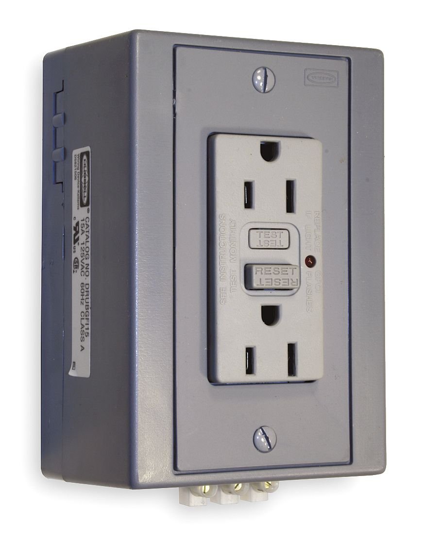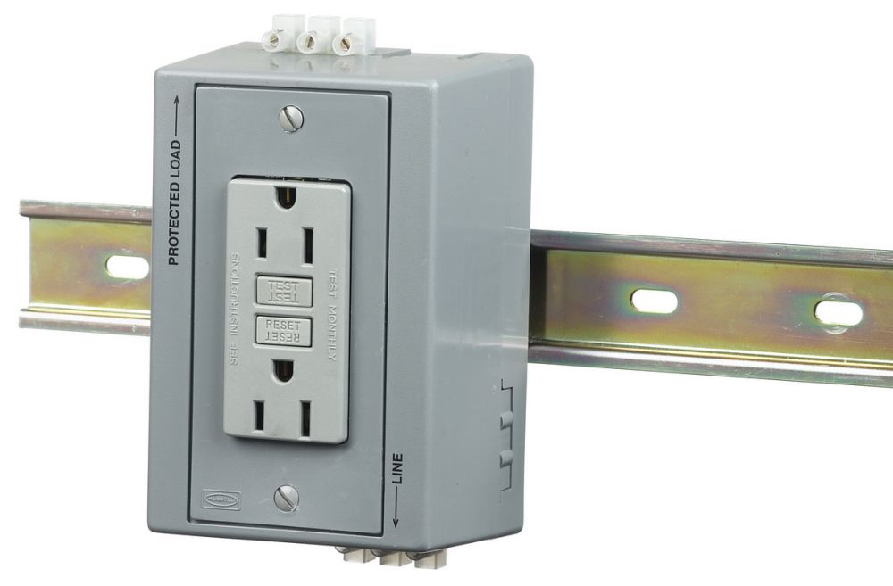 - Price For: Each Reset Type: Automatic NEMA Configuration: 5-15R Voltage: 125VAC Outlet Type: Decorator Power Indicator: Yes Wiring Method: Side Item: DIN Rail GFCI Receptacle Mounting Type: Panel Tamper Resistant: No Self-Testing: No Color: Gray Number of Wires: 3 HP: 0.5 Number of Poles: 2 Standards: cULus, CSA Certified