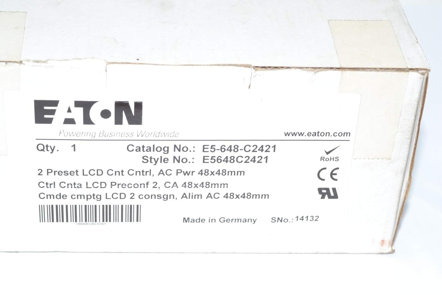 "Eaton / Control Automation E5-648-C2421 Counter, Preset; 1/16 din; 2 line LCD; 2presets; 90-260VAC"