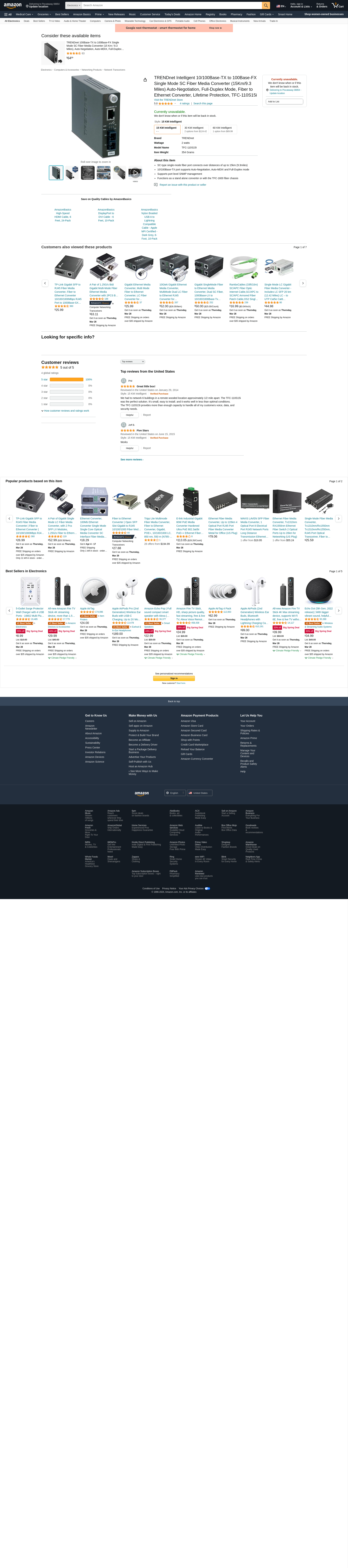 TRENDnet Intelligent 10/100Base-TX to 100Base-FX Single Mode SC Fiber Media Converter (15Km/9.3 Miles) Auto-Negotiation, Full-Duplex Mode, Fiber to Ethernet Converter, Lifetime Protection, TFC-110S15i