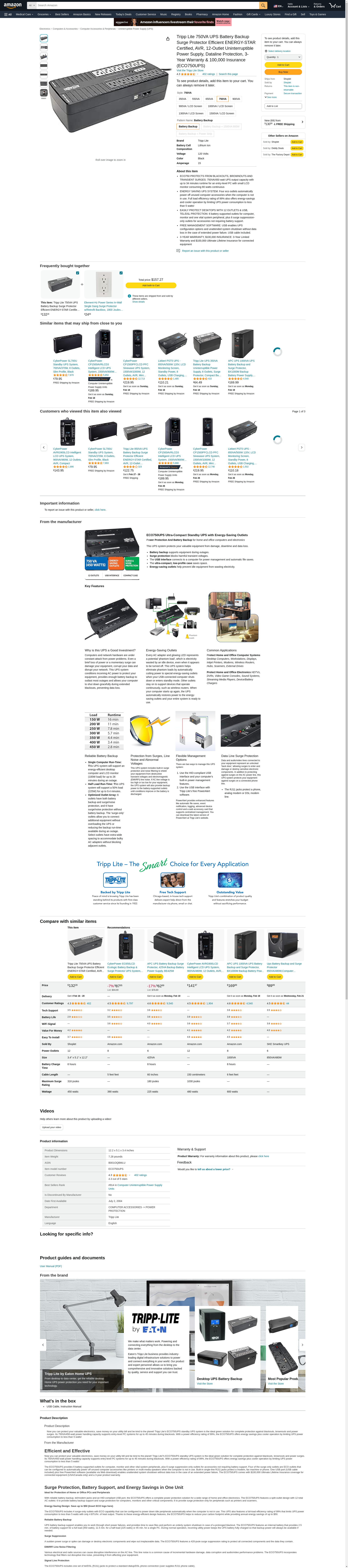 Amazon.com: Tripp Lite 750VA UPS Battery Backup Surge Protector Efficient ENERGY-STAR Certified, AVR, 12-Outlet Uninterruptible Power Supply, Dataline Protection, 3-Year Warranty & 100,000 Insurance (ECO750UPS) : Electronics