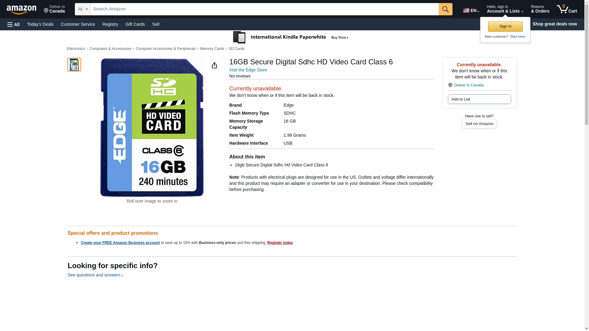 New - 16GB SDHC HD Video Card Class 6 - EDGDM-222604-PE