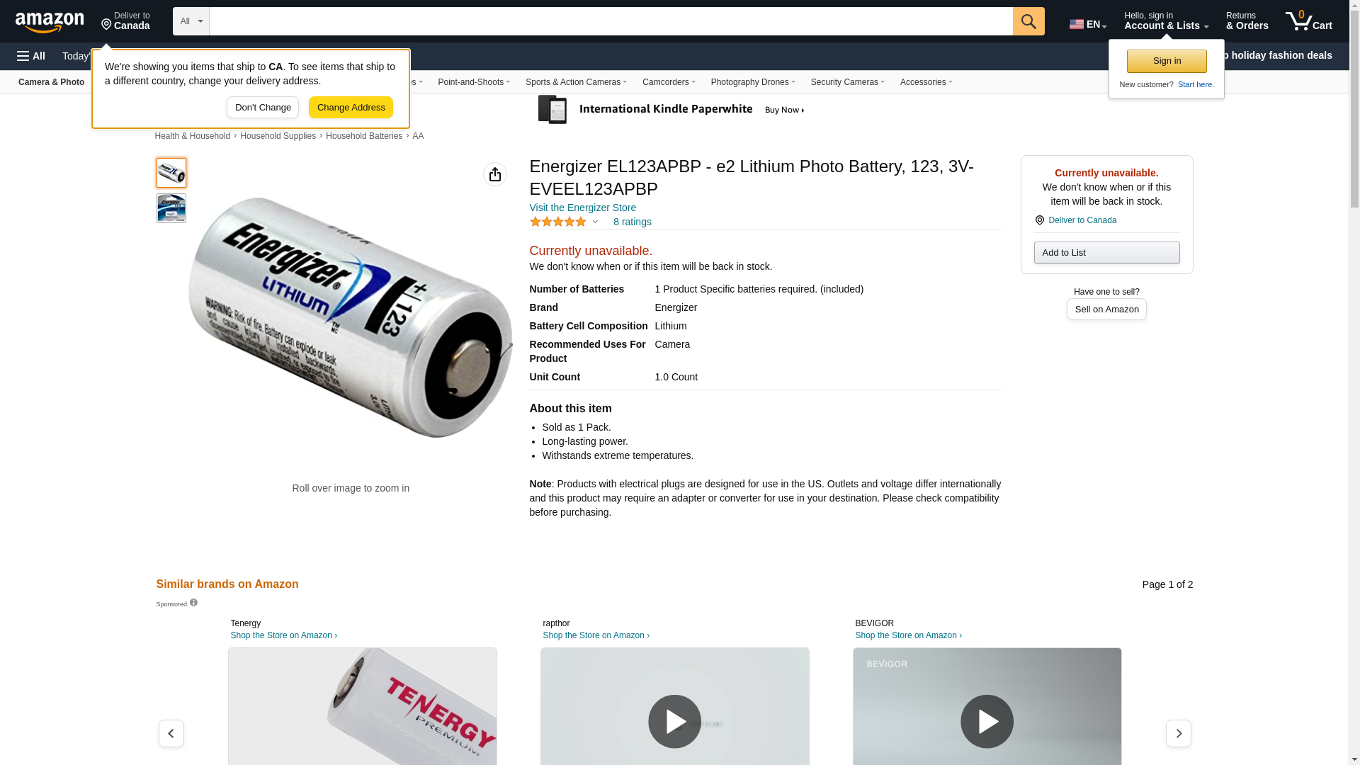 <B>Energizer : e2 Lithium Photo Battery, 123, 3V </B><BR> This battery is so dependable, you can count on it shot after shot. Made to deliver long-lasting power to keep up with todays high-tech, power-hungry cameras and flash units. Withstands even the most extreme temperatures. Global Product Type: Batteries-Specialty; Battery Type: Specialty; Battery Size: 123; For Use With: N/A.:<BR>Manufactured by.: Energizer