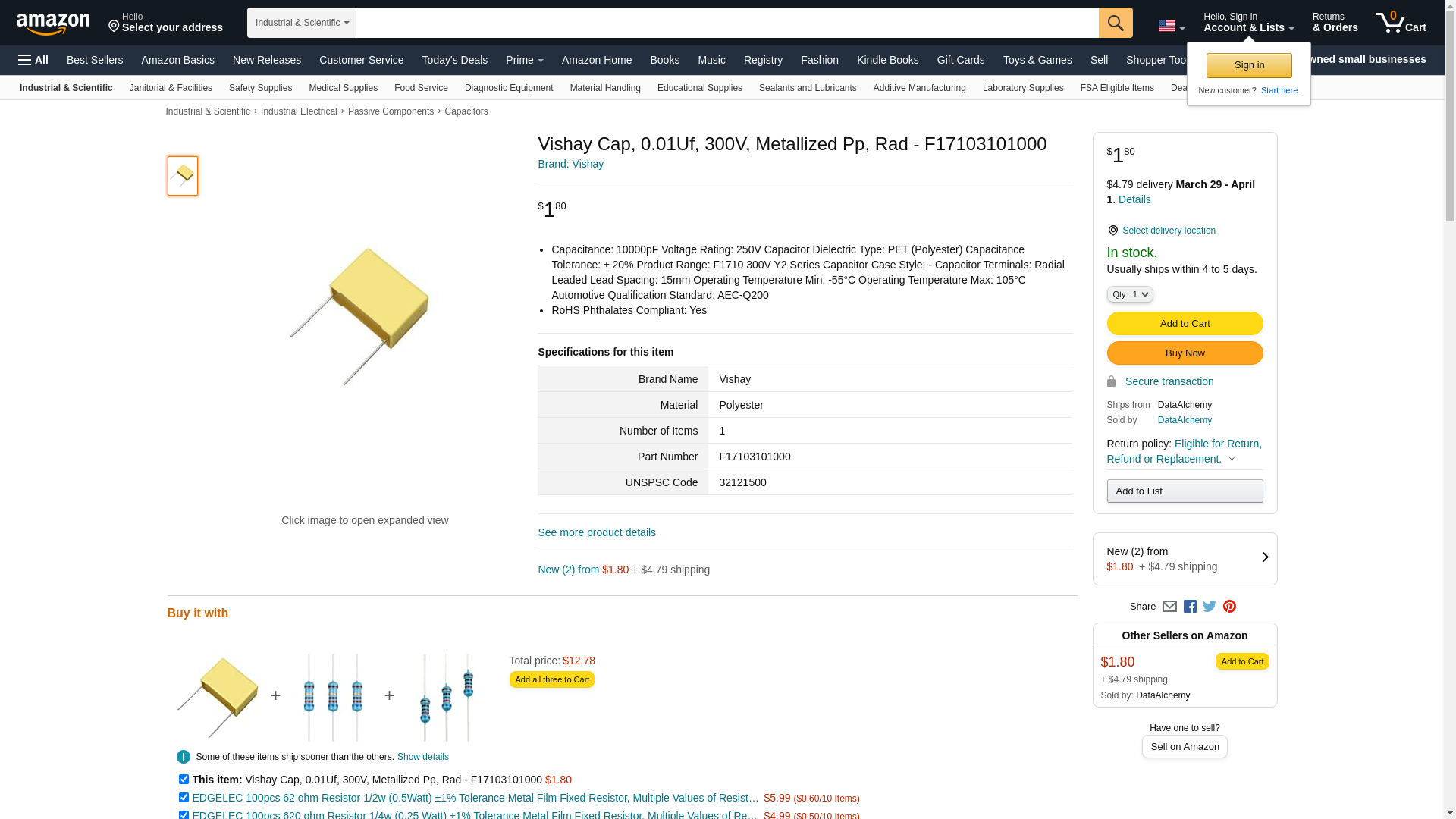 VISHAY SPECIALTY CAPACITORS F17103101000 F1710 Series 250 VAC 0.01 uF ±20% Radial Polyester Film Capacitor - 50 item(s)