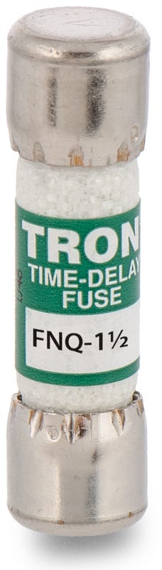 Featuring a fiberglass tube and nickel-plated brass endcaps, this time-delay fuse is suitable for use with motor control transformers and circuits with in-rush currents.<br /><br /> Item: Time Delay Midget Fuse<br /> Fuse Amps: 1-1/2A<br /> Indicating / Nonindicating: Nonindicating<br /> Series: FNQ<br /> Fuse Voltage Rating: 500VAC<br /> Class: Midget<br /> Element: Dual<br /> Body Material: Fiberglass<br /> Body Style: Cylindrical<br /> Rejection / Nonrejection: Nonrejection<br /> Fuse Interrupt Rating: 10kA at 500VAC<br /> Length: 1-1/2"<br /> Diameter: 13/32"<br /> Functionally Equal To: Mersen/Ferraz Shawmut GFN<br /> Standards: CE, UL-248-14 Guide JDYX, CSA Class 1422-01<br /> Green Environmental Attribute: RoHS Compliant