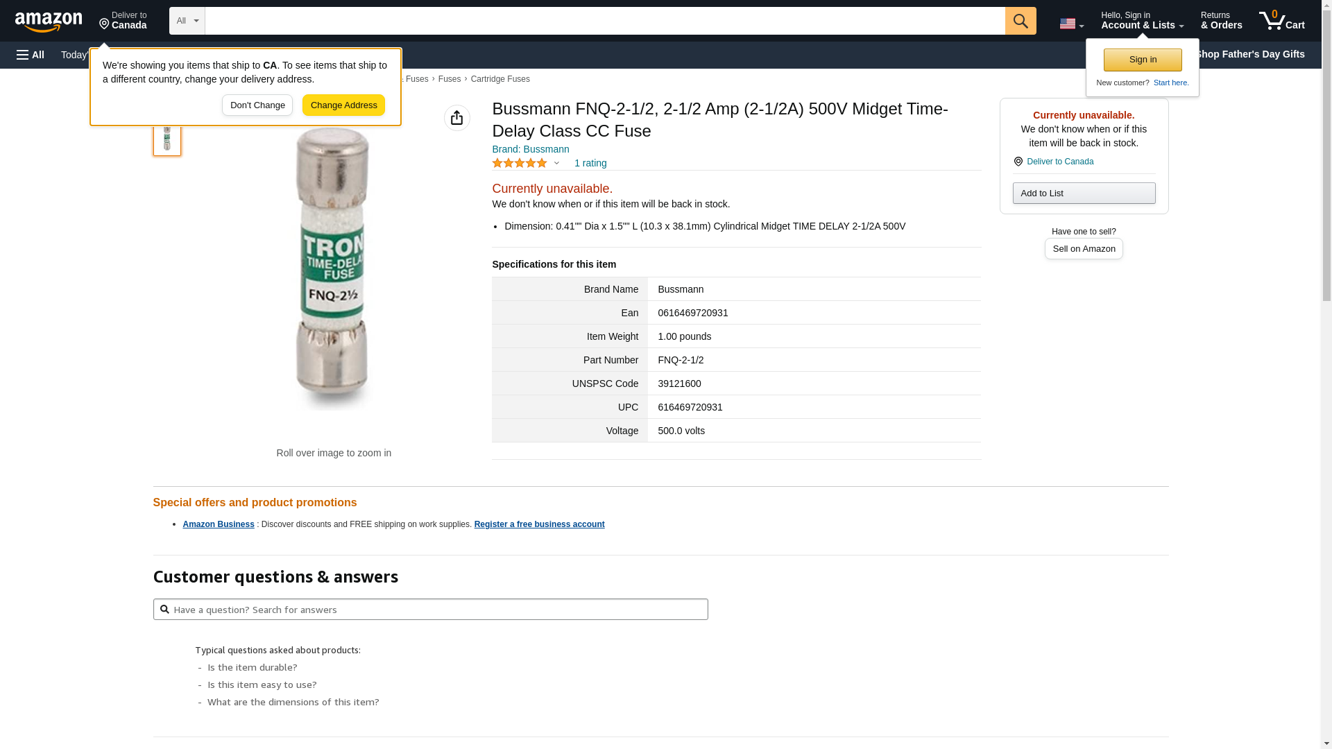 | Feature | Fuse, 2-1/2A, Midget, FNQ, 500VAC |