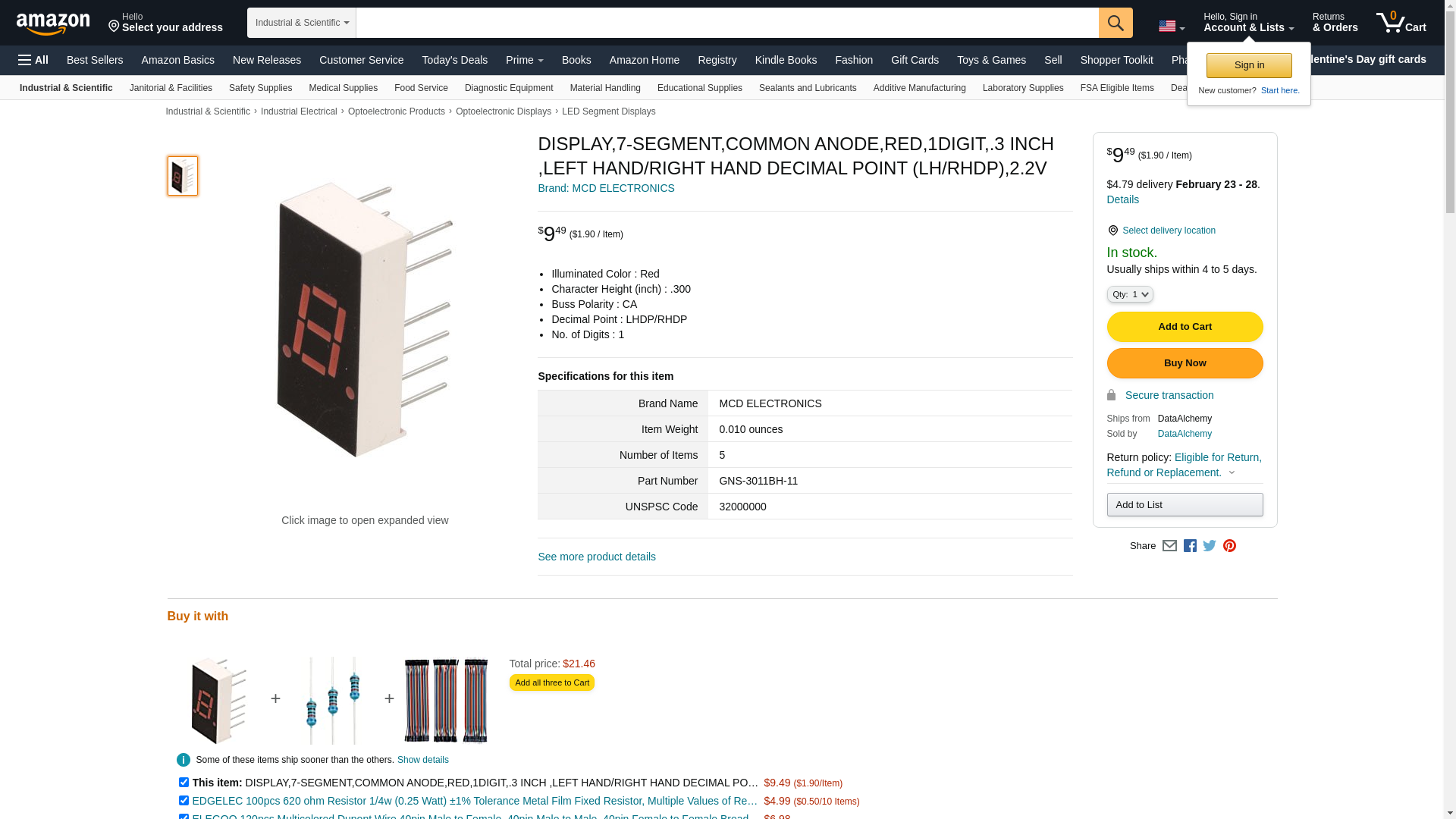 MCD GNS-3011BH-11 Display, 7-Segment, Common Anode, 1 Digit, 0.3" Left Hand/Right Hand, Decimal Point (Pack of 10)