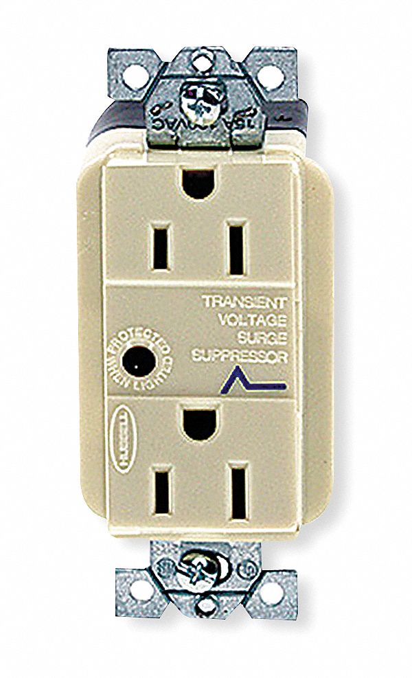 Hubbell 4 metal oxide varistors absorb transients Power On indicator light High-impact, nylon-face receptacles provide a high level of surge protection: 240 joules per mode. Most with alarm include muting switch. Isolated ground-grade models protect equipment from effects of noise on the ground circuit. For use in accordance with NEC/NFPA Article 250-74, Exception 2. Meet ANSI/IEEE C 62.41-1980 (IEEE 587) installation categories A and B. UL Listed (1449 and 498). 5-15R receptacles are CSA Certified. Surge Suppression Receptacles 125V This listing is for each. Tvss duplex type; ivory color; 5-15r configuration; 3 wire(s); specification grade; ul 498/1449, csa c22.2 approval; 125 vac at 60 hz voltage rating; 15 ampere current rating; grounding; 2 pole(s); back wiring; spikeshield[r], circuit guard[r] brand; includes light; material nylon; contact material brass