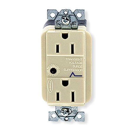 'Receptacle, Commercial Environments Application Environment, 15 Amps, 5-15R NEMA Configuration, Voltage 125VAC, Number of Poles 2, Number of Wires 3, Tamper Resistant No, Weather Resistant No, Surge Suppression Yes, Outlet Type Decorator, Mounting Type Flush, Phase 1, HP 0.5, Color Ivory, Material Nylon, Wiring Method Side, Power Indicator Yes, Standards UL Listed, CSA Certified, Number of Gangs 1'