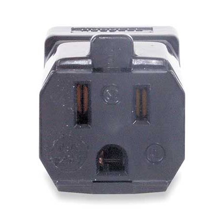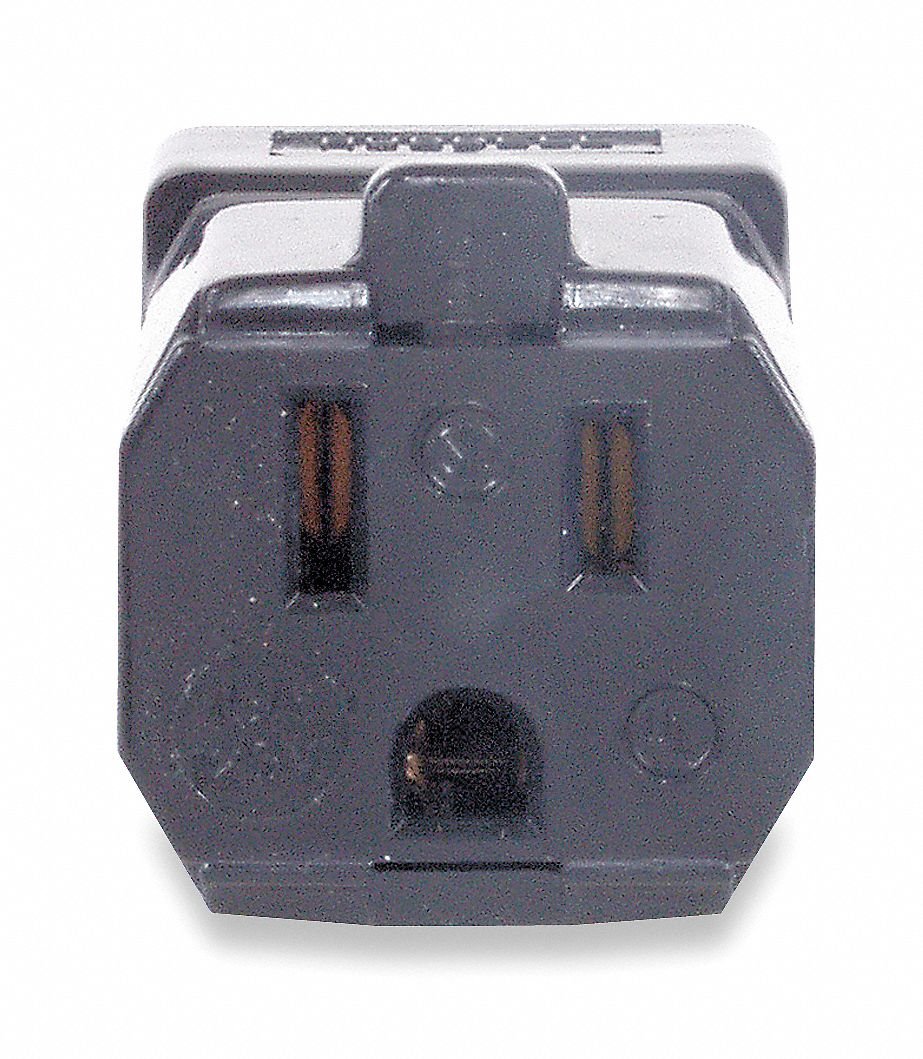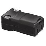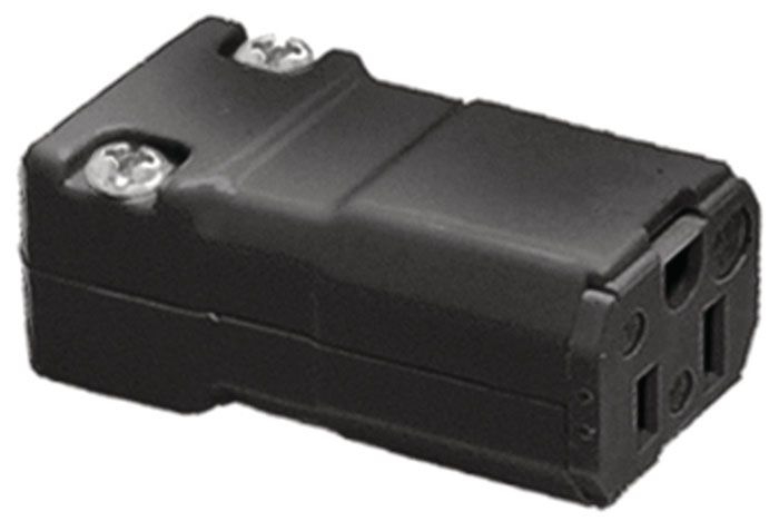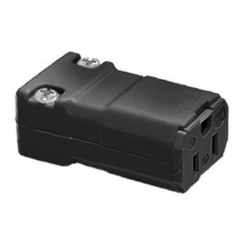 Receptacle for 3-prong Edison plugs (NEMA 5-15R). Square black nylon housing. Designed for 15 amps at 125 volts.