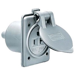 <br /><br /> Item: Flanged Receptacle<br /> Type - Plugs and Receptacles: Straight Blade<br /> Application Environment: Heavy Use Industrial/Harsh Environments<br /> Amps - Plugs and Receptacles: 20<br /> NEMA Receptacle Configuration - Plugs and Receptacles: 5-20R<br /> Voltage - Plugs and Receptacles: 125VAC<br /> Number of Poles: 2<br /> Number of Wires: 3<br /> Tamper Resistant: No<br /> Weather Resistant - Plugs and Receptacles: Yes<br /> Outlet Type - Plugs and Receptacles: Single<br /> Mounting Type - Plugs and Receptacles: Panel<br /> Color - Plugs and Receptacles: Gray<br /> Item - Plugs and Receptacles: Flanged Receptacle<br /> Wiring Method - Plugs and Receptacles: Side<br /> Surge Suppression: No<br /> Special Features: 2.25" W x 2.87" H<br /> Material: Nylon<br /> Phase: 1<br /> HP: 1.0<br /> Power Indicator: No<br /> Corrosion Resistant: Yes<br /> Number of Gangs: 1<br /> Description: Grounding
