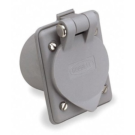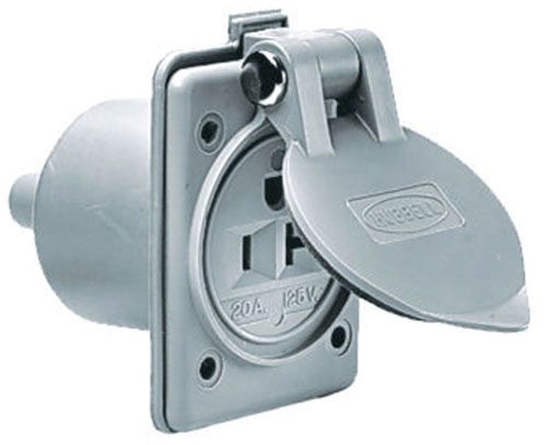 ' Flanged Receptacle, Heavy Use Industrial/Harsh Environments Application Environment, 20 Amps, 5-20R NEMA Configuration, Voltage 125VAC, Number of Poles 2, Number of Wires 3, Tamper Resistant No, Weather Resistant Yes, Surge Suppression No, Outlet Type Single, Mounting Type Panel, Special Features Corrosion Resistant, Phase 1, HP 1.0, Color Gray, Material Nylon, Wiring Method Side, Power Indicator No, Description Grounding, Standards UL Listed, CSA Certified, NEMA WD-6, Number of Gangs 1 '